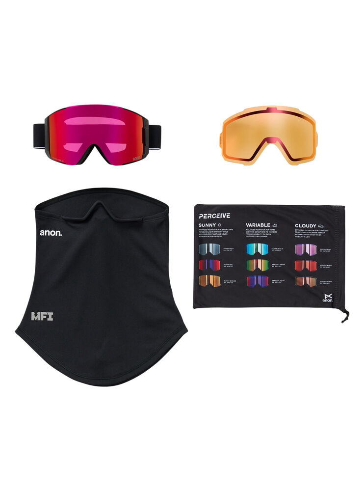 Ski & Snowboard Goggle Bundle. The terrain-defining clarity of Perceive optics and the simplicity of M-Fusion for fast, easy lens changes. The Anon Sync Goggles offer the terrain-defining clarity of Perceive optics and the convenience of our M-Fusion magnetic latch system to secure and guide lenses into place. Full-perimeter venting ensures maximum airflow for a clear, fog-free view in all conditions. They are over the glass compatible for wearing with eyeglasses and includes a bonus lens for different lighting conditions, a mesh MFI face mask, plus a microfiber bag for storage and lens cleaning.