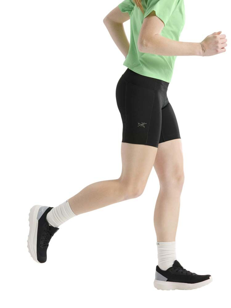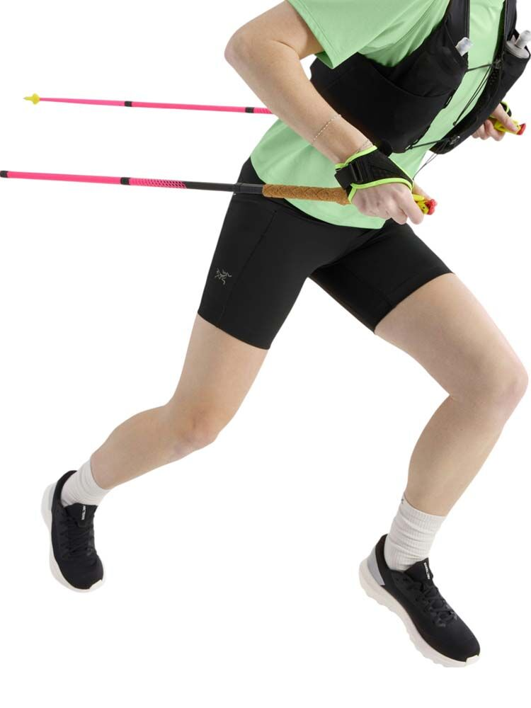 High-rise 8" mountain running short with waistband and thigh pockets. Find your pace in the Essent-a high-rise short with a next-to-skin fit and 8" inseam ready to run in the mountains. The lightweight material is breathable, stretchy, and sweat-wicking to help your miles feel cooler. Stretch-mesh around the entire waistband provides b ounce-free storage for your phone while small essentials like gels can be stored in the thigh pockets.