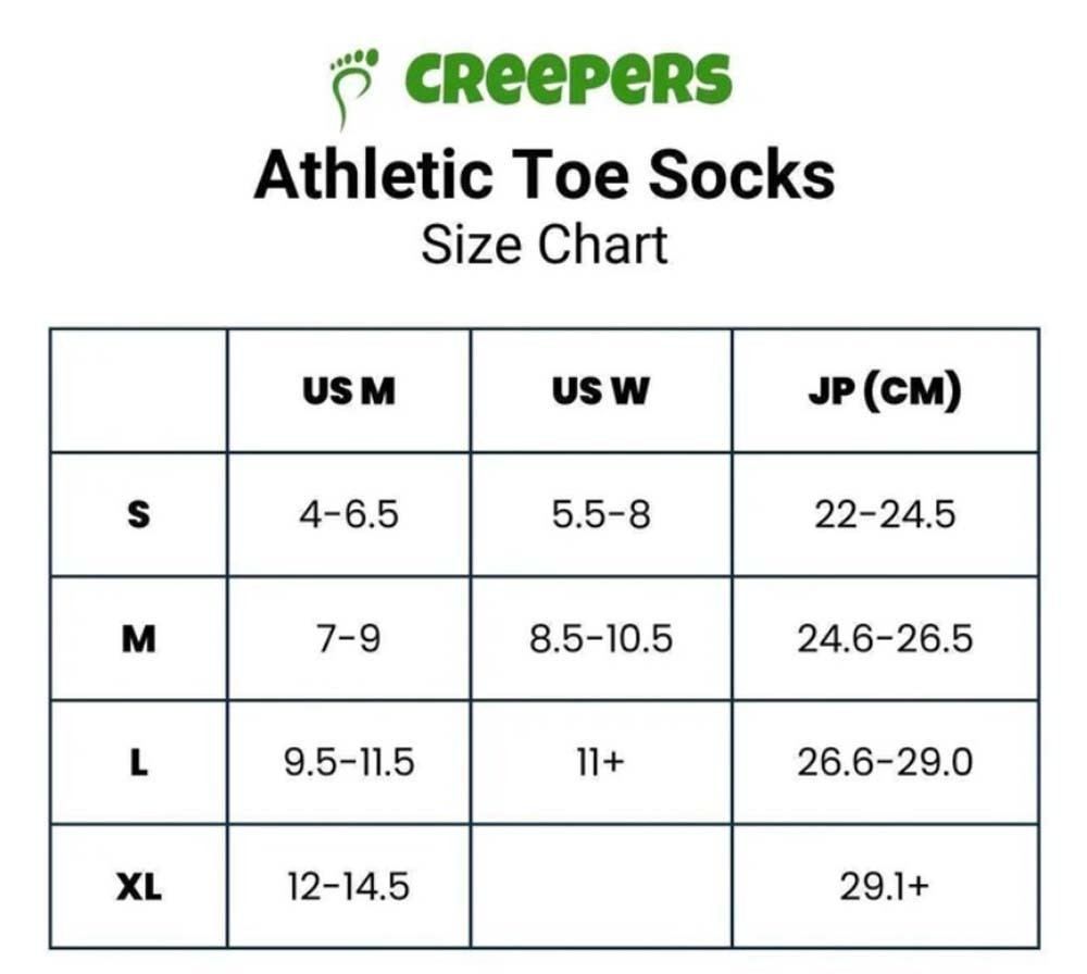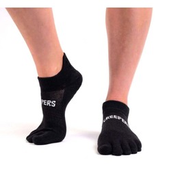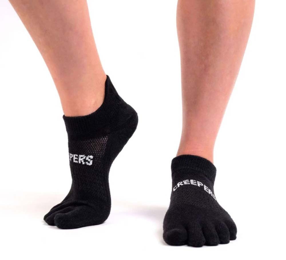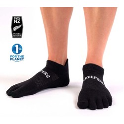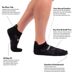 Meet the No Show Toe Socks. Our lightweight, athletic toe sock is now in the popular no show length that fits anatomically and perfectly around your ankle and foot, like a glove. The ultimate performance toe sock for full-foot comfort and performance thanks to our unique merino blend yarn and seamless, breathable, adaptive and lightweight fabric. Creepers no show toe socks are produced with our durable 2.0 performance fabric, developed after years of testing to provide the best mix of durability, softness and fit. The no-show ankle toe socks are perfect for running, sports and everyday wear with a minimalist profile. The cuff of our merino wool no show toe socks, hugs anatomically under the ankle bones ankle to secure the sock in place and keep dirt and debris out of your socks. Our performance Merino toe socks hug under your ankle bones for a secure fit and a profile in line with most running shoes. They also have a low-friction achilles tab to ensure a lasting fit and to minimize irritation from shoes. Venture further, play longer and feel better in full foot comfort in Creepers' Merino wool, no show toe socks.