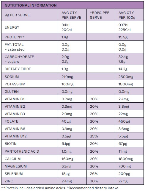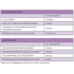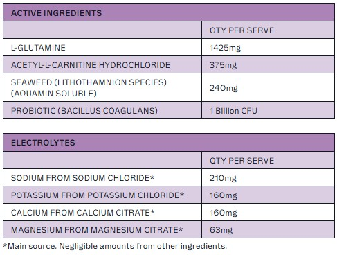 Natural Flavour, Mineral Salts (Calcium Citrate, Sodium Chloride, Magnesium Citrate, Potassium Chloride), Soluble Maize Fibre, L-Glutamine, Acidity Regulator (Citric Acid), Anti-Caking Agent (Silicon Dioxide), Acetyl-L-Carnitine Hydrochloride, Seaweed (Lithothamnion species), Natural Colour (Anthocyanin), Sweetener (Sucralose), Minerals (Zinc Gluconate, Sodium Selenite), Probiotic (Bacillus coagulans), Vitamin B Complex – B3 (Niacin), B5 (Pantothenic Acid), B6 (Pyridoxine Hydrochloride), B2 (Riboflavin), B1 (Thiamin Hydrochloride), B9 (Folic Acid), B7 (D-Biotin), B12 (Cyanocobalamin)
