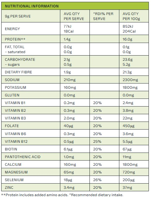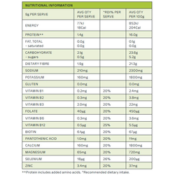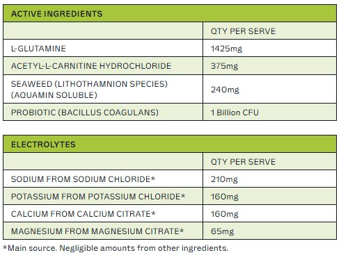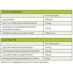 Soluble Maize Fibre, Mineral Salts (Calcium Citrate, Sodium Chloride, Magnesium Citrate, Potassium Chloride), L-Glutamine, Natural Flavour, Acidity Regulator (Citric Acid), Anti-Caking Agent (Silicon Dioxide), Acetyl-L-Carnitine Hydrochloride, Seaweed (Lithothamnion species), Sweetener (Sucralose), Minerals (Zinc Gluconate, Sodium Selenite), Probiotic (Bacillus coagulans), Vitamin B Complex – B3 (Niacin), B5 (Pantothenic Acid), B6 (Pyridoxine Hydrochloride), B2 (Riboflavin), B1 (Thiamin Hydrochloride), B9 (Folic Acid), B7 (D-Biotin), B12 (Cyanocobalamin)