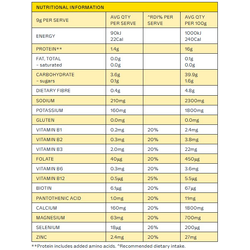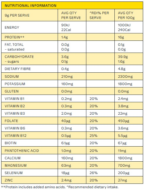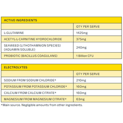 Natural Flavour, Mineral Salts (Calcium Citrate, Sodium Chloride, Magnesium Citrate, Potassium Chloride), L-Glutamine, Acidity Regulator (Citric Acid), Soluble Maize Fibre, Anti-Caking Agent (Silicon Dioxide), Acetyl-L-Carnitine Hydrochloride, Seaweed (Lithothamnion species), Natural Colour (Turmeric), Sweetener (Sucralose), Minerals (Zinc Gluconate, Sodium Selenite), Probiotic (Bacillus coagulans), Vitamin B Complex – B3 (Niacin), B5 (Pantothenic Acid), B6 (Pyridoxine Hydrochloride), B2 (Riboflavin), B1 (Thiamin Hydrochloride), B9 (Folic Acid), B7 (D-Biotin), B12 (Cyanocobalamin)