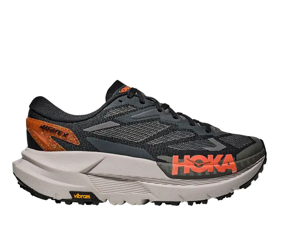 Peak plushness for tenacious trail efforts. Calling all trail racing fiends, gravel grinders, and 100-milers. There's a new trail titan in town. Built for long-haul efforts, the Mafate X delivers supreme plushness with a dual-density, premium foam chassis, PEBA top layer, and a pop of propulsion thanks to our forked carbon fiber plate. We've implemented an ultralight woven upper that allows for easy drainage and Vibram Megagrip outsole with pod-like cutouts to ensure a smooth ride over variable terrain.