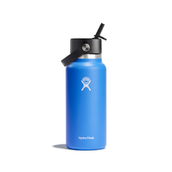 Wide mouth water bottle with leakproof straw. A 32 oz Wide Mouth water bottle with our leakproof Flex Straw Cap-easy to fill, easy to drink. Open it up, add your ice, and flip to sip. The insulated stainless steel keeps it cold for up to 24 hours.