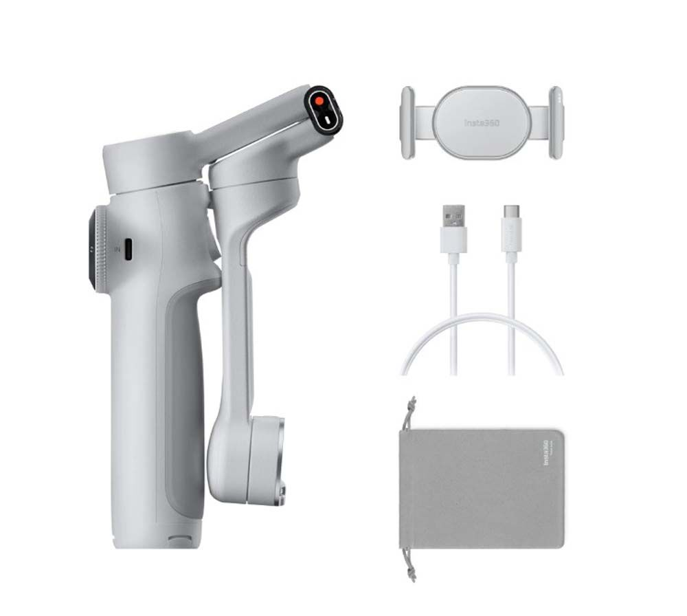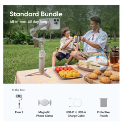Includes 1x Insta360 Flow 2, 1x Magnetic Phone Clamp, 1x USB-C to USB-A Charge Cable and 1x Protective Pouch.