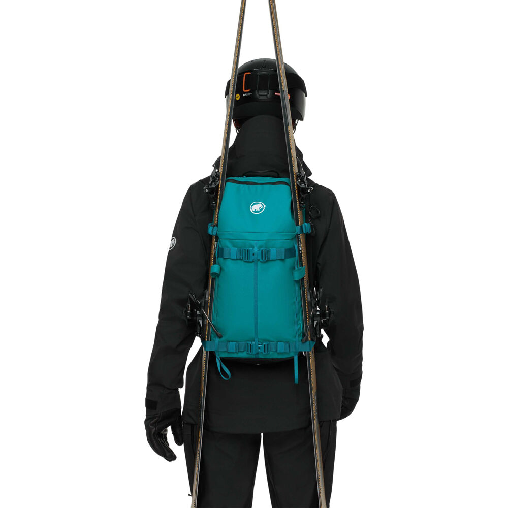 The legendary Nirvana is our true snow sports pack, optimized for freeriding and lift-supported ski touring. Versatile and well-equipped with specialized winter features, the Nirvana 22 is the ideal partner for a wide range of plans. Organize and stow all your gear with easy access to the main compartment through the 270 Degree zippered back panel. A separate avalanche equipment compartment ensures you are always prepared, while a dedicated internal sleeve makes the pack compatible with the Mammut Back Protector. Skis and splitboards can be attached diagonally or A-frame style. An optimized carrying system and women's fit, features adapted shoulder straps, a tailored hip belt, and a shorter back length for maximum comfort and freedom of movement. The specially selected fabrics, including the extremely robust outer, are PFC-free and made from recycled materials.