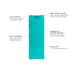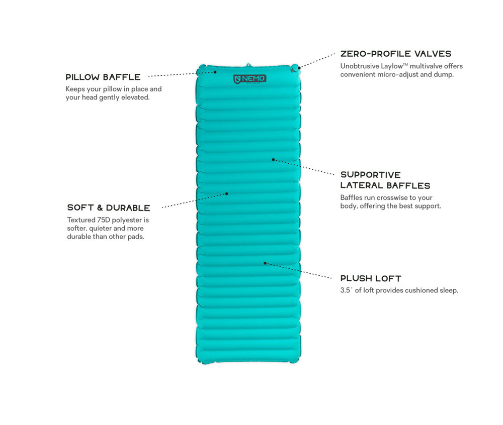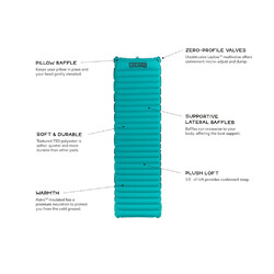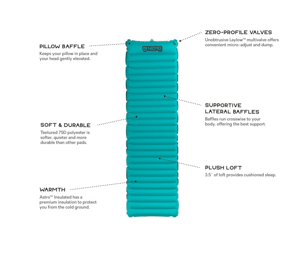 Ultra lightweight and simple, the Astro series offers a plush 3.5-inch thickness, a premium fabric suite, and lateral baffles. Lateral baffles are more comfortable than vertical baffles, and prevent the sides of the pad from curling around your body. The large Pillow Baffle at the head end of the pad ensures that your pillow doesn't slide off in the middle of the night, and gives a couple extra inches of height to bolster your camp pillow. Astro is updated in 2019 with the Laylow zero-profile, multi-functional, micro-adjustable valve offers convenient inflation, personalized comfort, and deflation.