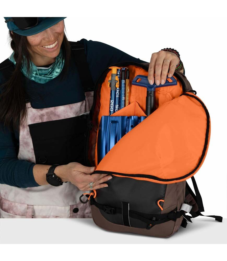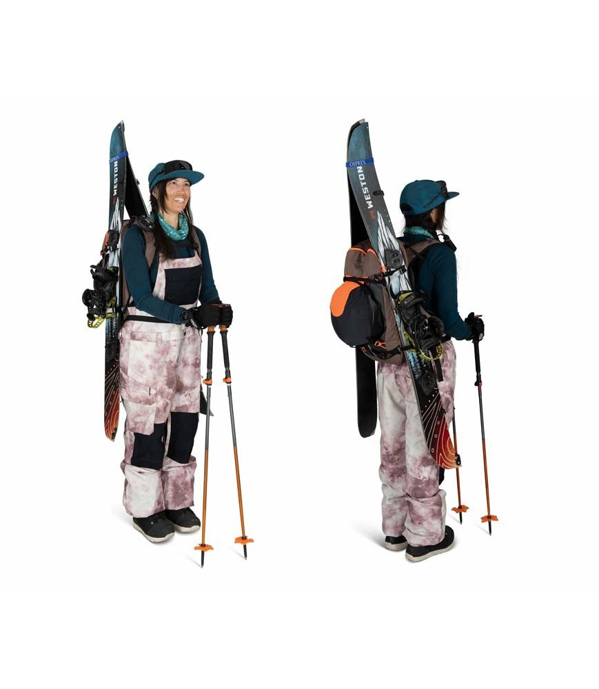 Snow-Specific Features: Equipped with a snow-shed backpanel, diagonal and A-frame ski carry, snowboard carry, ice tool attachment and intuitive access to safety avalanche gear.