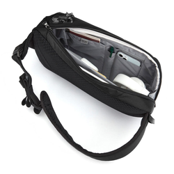 • Cut-resistant anchor strap locks around a fixed object to protect your bag