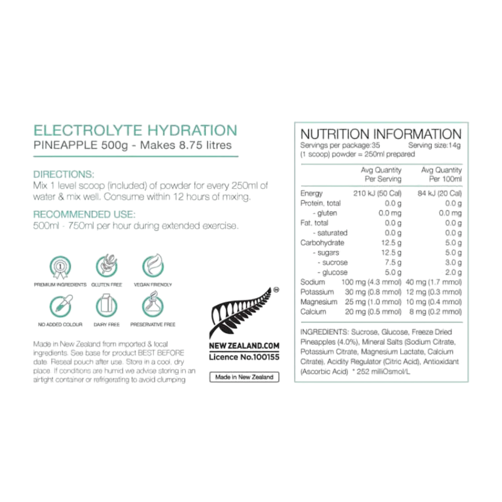 PURE Electrolyte Hydration is a premium natural electrolyte drink base using real freeze dried fruit, carbohydrates and electrolytes. PURE Electrolyte Hydration is a natural isotonic electrolyte sports drink base. When you open a bag of PURE Electrolyte Hydration the first thing you'll notice is the amazing smell of fresh fruit. Made from real freeze-dried fruit powder, when you add water you can actually see the real fruit particles in your drink bottle. HYDRATION: Proper hydration is essential during exercise, when you are dehydrated, or unwell. When mixed with water to the correct amounts, PURE Electrolyte Hydration will assist with ensuring adequate fluid intake during exercise and to prevent or treat mild dehydration that may occur as a result of sustained strenuous exercise. ENERGY: Made with a specific blend of sucrose and glucose which helps with rapid replacement of energy, PURE Electrolyte Hydration is designed to promote the availability of energy during exercise. It's not sickly sweet so you can easily drink it at full strength. ELECTROLYTES: PURE Electrolyte Hydration is formulated with specific electrolytes for people who lead an active lifestyle, helping to replace electrolytes lost during sweating & exercise.