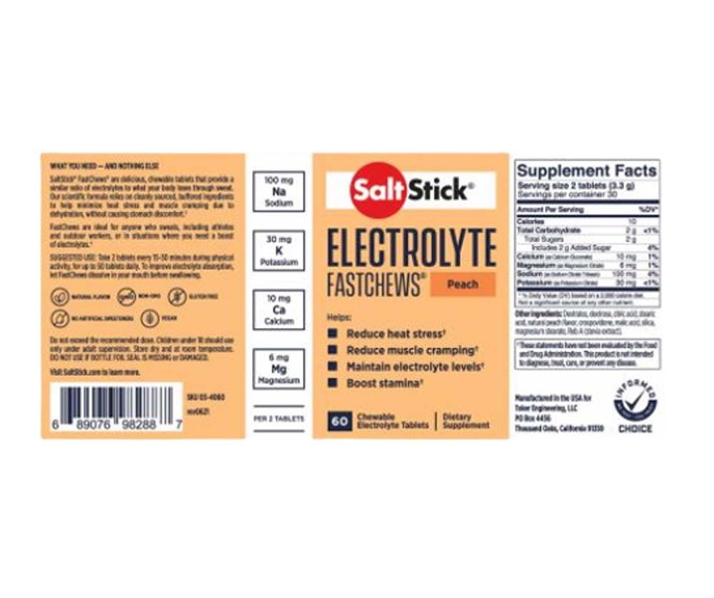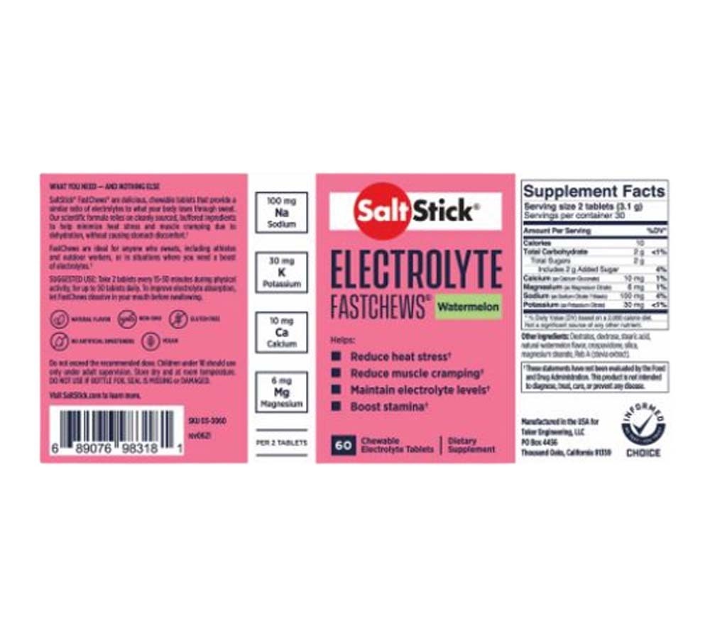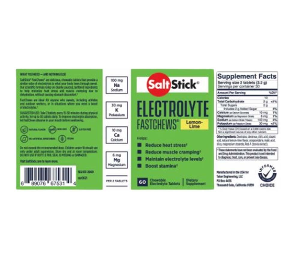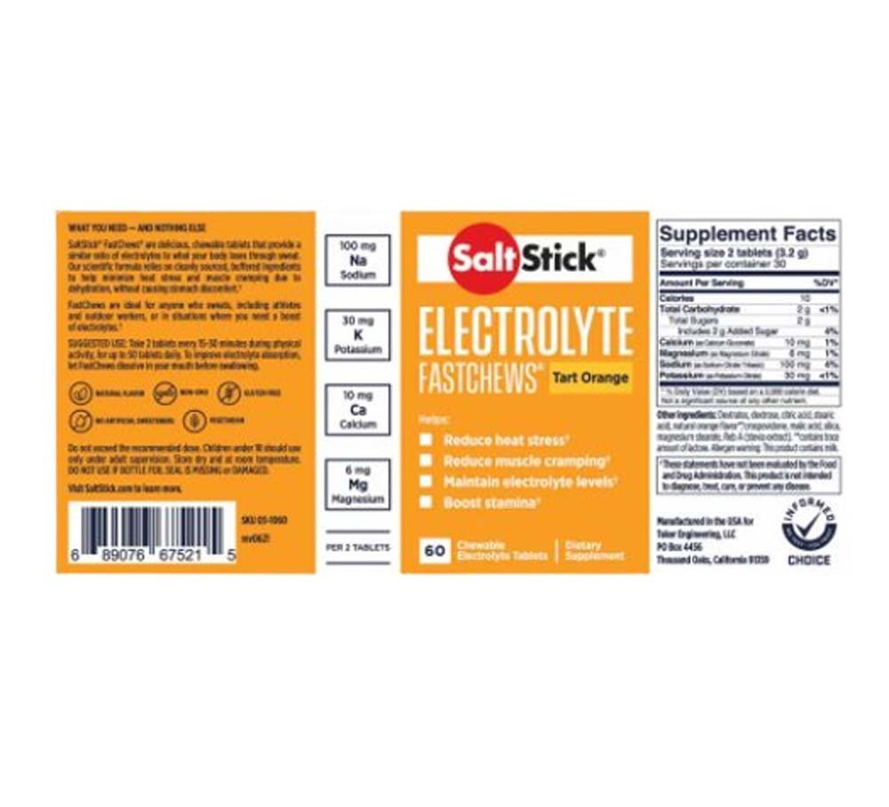 SaltStick FastChews are delicious, chewable tablets that provide a similar ratio of electrolytes to what your body loses through sweat. Our scientific formula relies on cleanly sourced, buffered ingredients to help minimize heat stress and muscle cramping due to dehydration, without causing stomach discomfort. FastChews are ideal for anyone who sweats, including athletes and outdoor workers, or in situations where you need a boost of electrolytes.