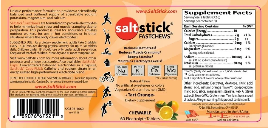 SaltStick FastChews are delicious, chewable tablets that provide a similar ratio of electrolytes to what your body loses through sweat. Our scientific formula relies on cleanly sourced, buffered ingredients to help minimize heat stress and muscle cramping due to dehydration, without causing stomach discomfort. FastChews are ideal for anyone who sweats, including athletes and outdoor workers, or in situations where you need a boost of electrolytes.