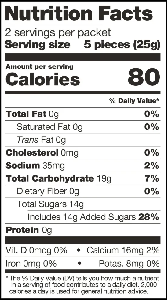 Lemon + Green Tea: Sugar, Glucose Syrup, Water, Pectin, Lemon Powder, Citric Acid, Lactic Acid, Green Tea Matcha. *The Lemon + Green Tea flavor has 4mg of caffeine per pack from the natural caffeine in green tea.