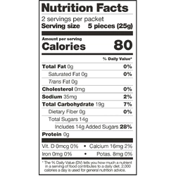 Sour Cherry: Sugar, Glucose Syrup, Water, Pectin, Cherry Powder, Citric Acid, Lactic Acid, Green Tea Extract. *The Sour Cherry flavor adds 50mg of caffeine per pack from green tea for some extra boost and focus.