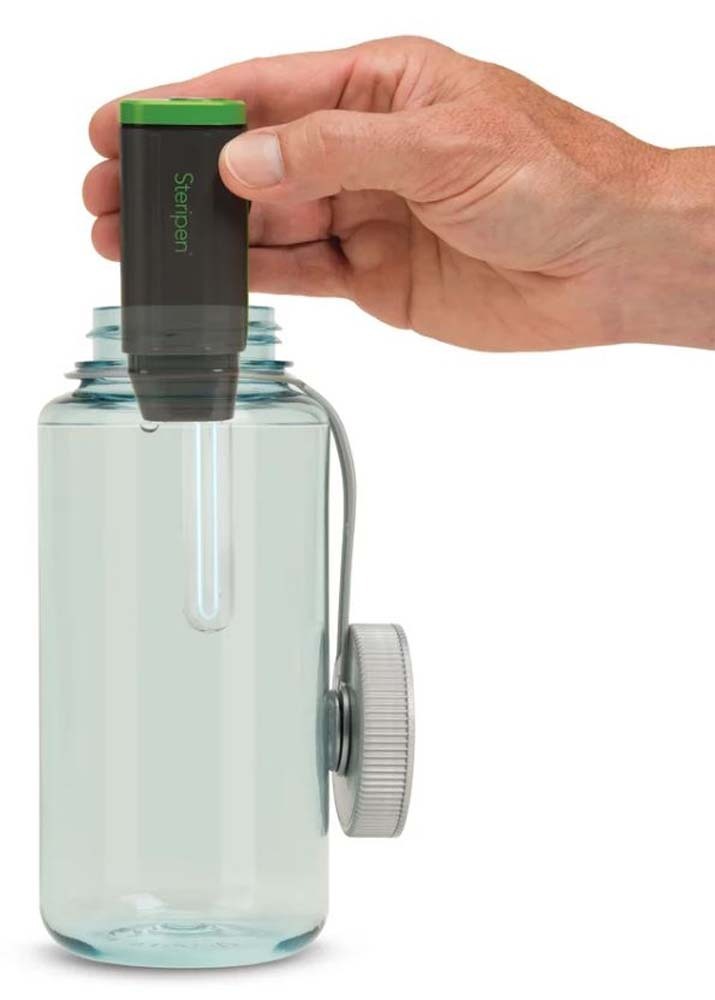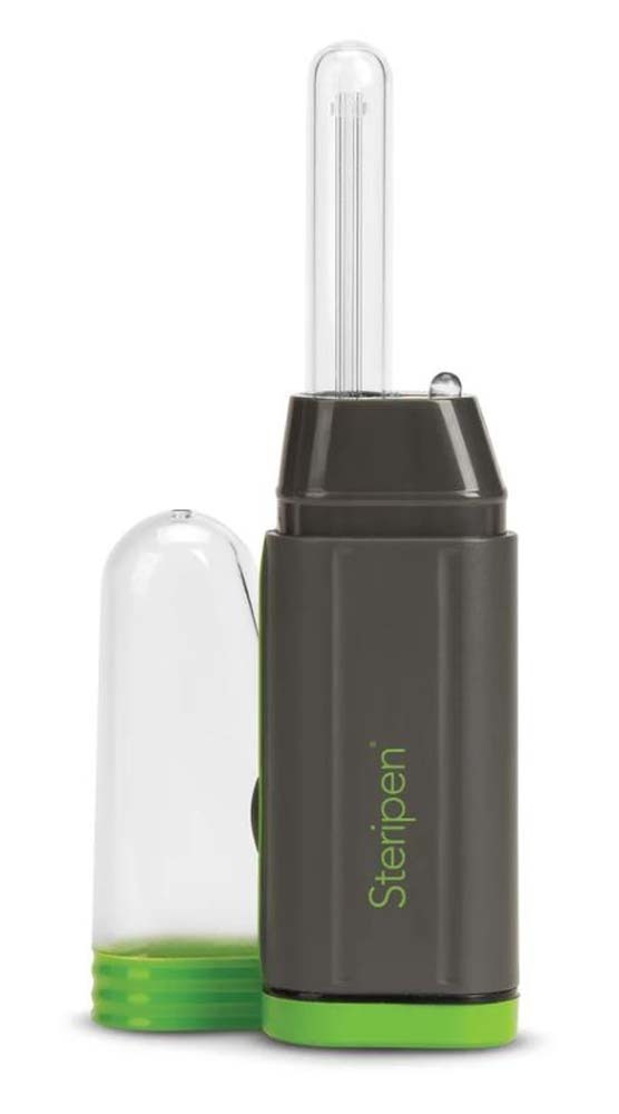 Steripen Adventurer Opti UV Water Purifier: when camping, backpacking, hiking, if you won't have access to the power grid for several days a time, this is the water purification system for you. The Adventurer Opti UV water purifier is essential gear for thousands of adventurers and features a unique technology " an optical eye senses water to ensure safe use and effective treatments. The revolutionary optical water sensor doubles as an integrated LED flashlight for added convenience on the trail or around the campsite: hold down the activation button for three seconds to illuminate the darkness. Rugged design and construction trusted by thousands of endurance athletes. Adventurer Opti is powered by two CR123 batteries making it a lightweight water purification system and keeping it operating effectively in even cold environments. The long-lasting UV lamp purifies up to 8,000 liters! Works in containers with a minimum 1.75 inch diameter opening. (Like Nalgene wide-mouth bottles one liter bottles.)