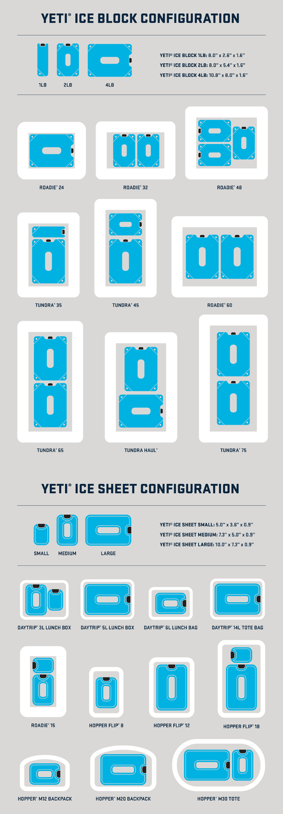 Scientifically developed to help your regular ice stay frozen longer. YETI ICE is filled to the brim with science, dialed in to the most effective temperature to maximize the ice retention of any cooler, with a durable design that is break-resistant. Its custom shape reduces freezing time and multiple size options mean that you can outfit everything from your Roadie 24 to your Tundra 350 with YETI ICE. It works as an ice supplement, a welcome addition to your ice stash to make sure your contents stay colder for longer.